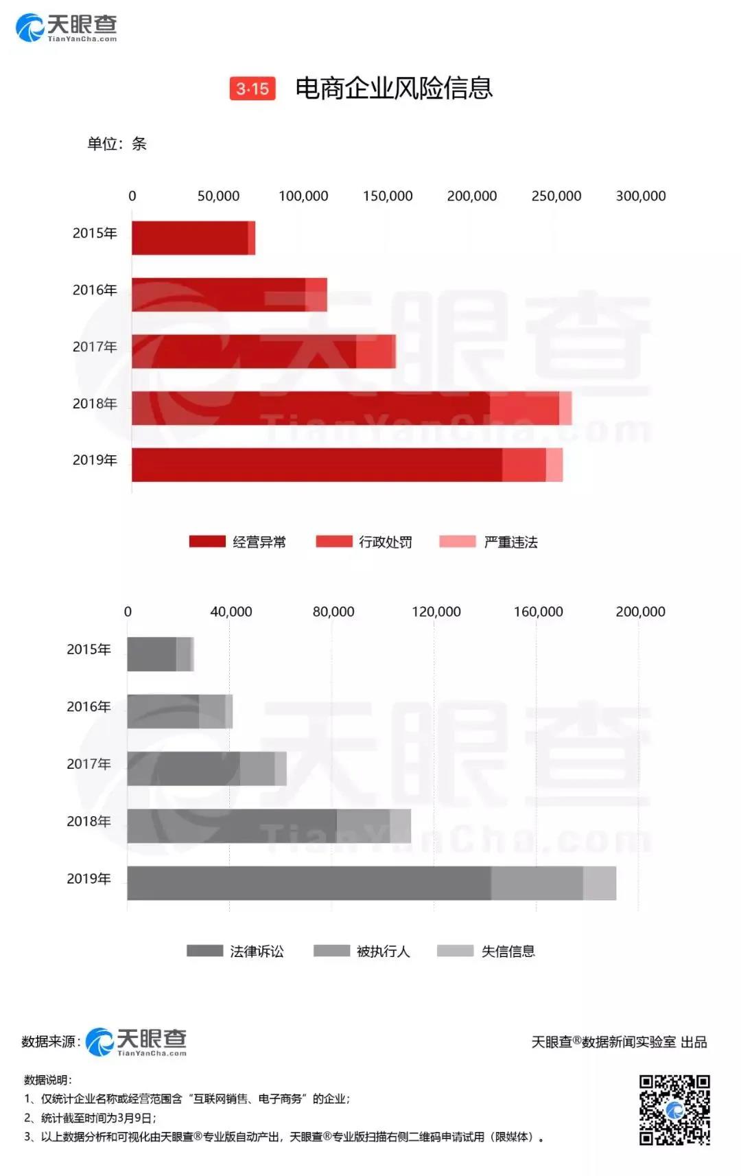 經(jīng)營(yíng)風(fēng)險(xiǎn)方面,天眼查專(zhuān)業(yè)版數(shù)據(jù)顯示,電商企業(yè)近5年累計(jì)產(chǎn)生超73萬(wàn)次經(jīng)營(yíng)異常,2019年就有20萬(wàn)次,占比近30%;而電商企業(yè)的行政處罰數(shù)量也從2015年起開(kāi)始翻倍增長(zhǎng),直到2019年新增數(shù)量才有所回落。