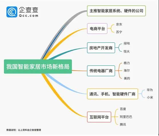 不過(guò),目前中國(guó)智能家居市場(chǎng)正在形成新的格局,企查查整理了部分涉足智能家居的品牌,大致分布在這六大陣營(yíng):主推智能家居概念的智能家居系統(tǒng)和智能家居硬件初創(chuàng)公司陣營(yíng);以格力、海爾、美的等為代表的傳統(tǒng)電器廠(chǎng)商陣營(yíng);以華為、小米等為代表的通訊、手機(jī)、智能硬件廠(chǎng)商陣營(yíng);以BAT為代表的互聯(lián)網(wǎng)平臺(tái)陣營(yíng);以京東、蘇寧等為代表的電商平臺(tái);以綠地、恒大為代表的房地產(chǎn)開(kāi)發(fā)商。
